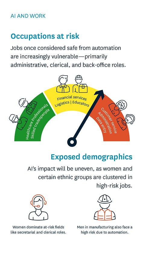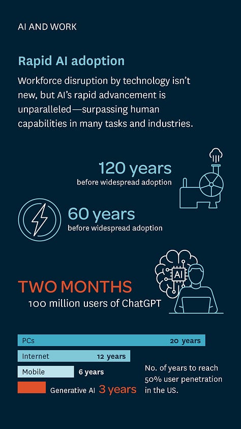 Your insights into the disruption of AI don't go far enough. For example the legal profession is at considerable risk - their business is built upon case law and precidents - they have the ability to perform computer searches now on this data, but nothing will compare to the ability of AI to generate an opinion based upon all the historical judgements and data available.